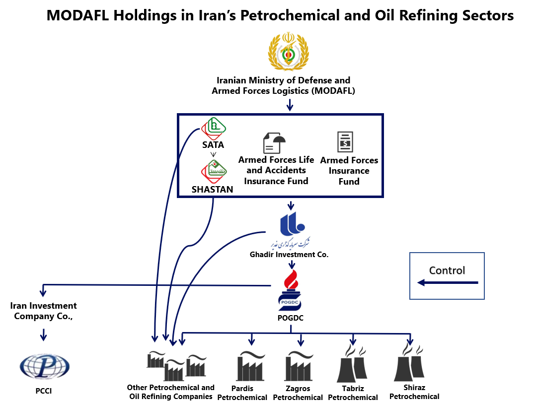 The Iranian Ministry of Defense (MODAFL) controls the country's petrochemical and refining sectors through the major holding companies. This includes the Iranian holding company the Ghadir Investment Company and its subsidiary company the Persian Oil and Gas Development Company (POGDC).